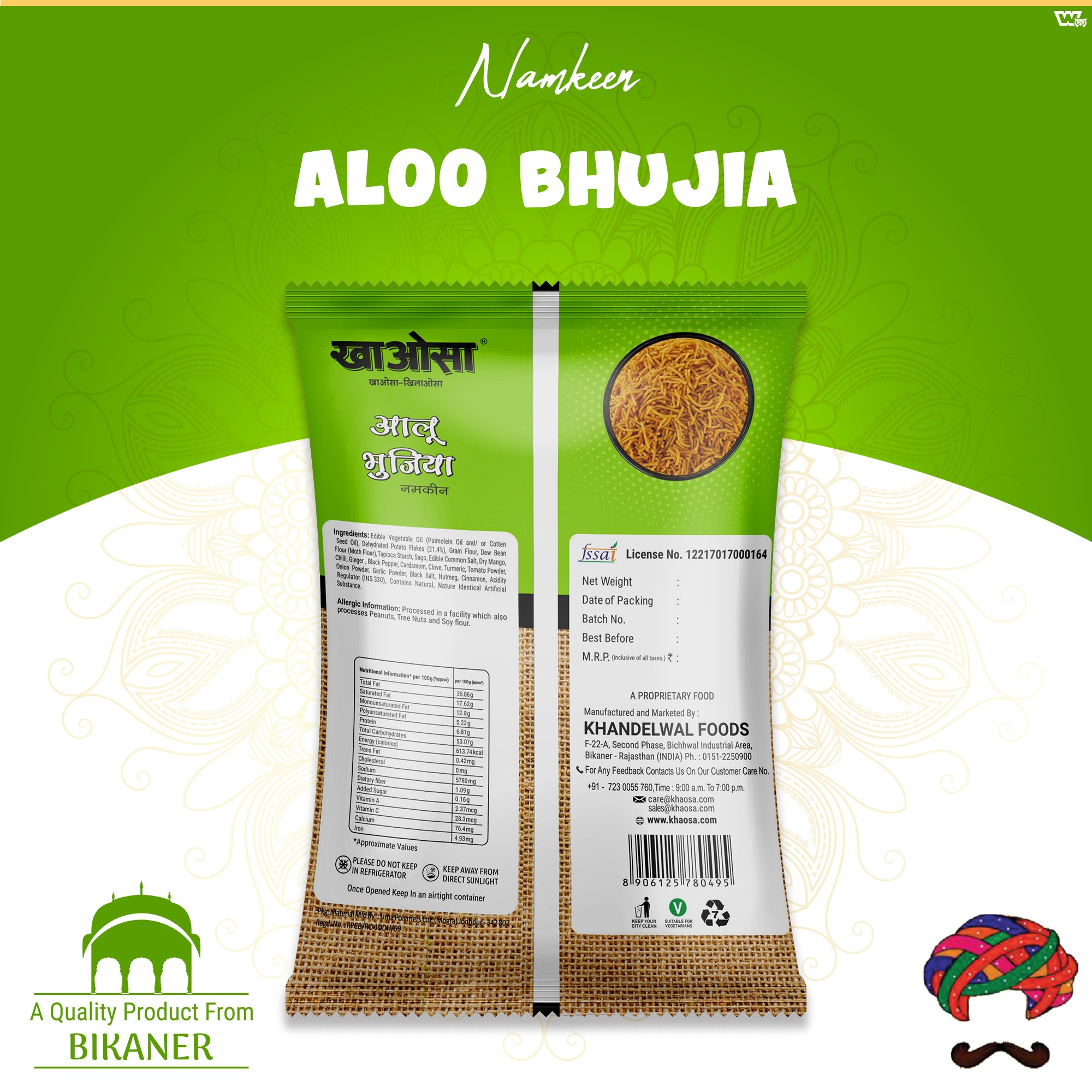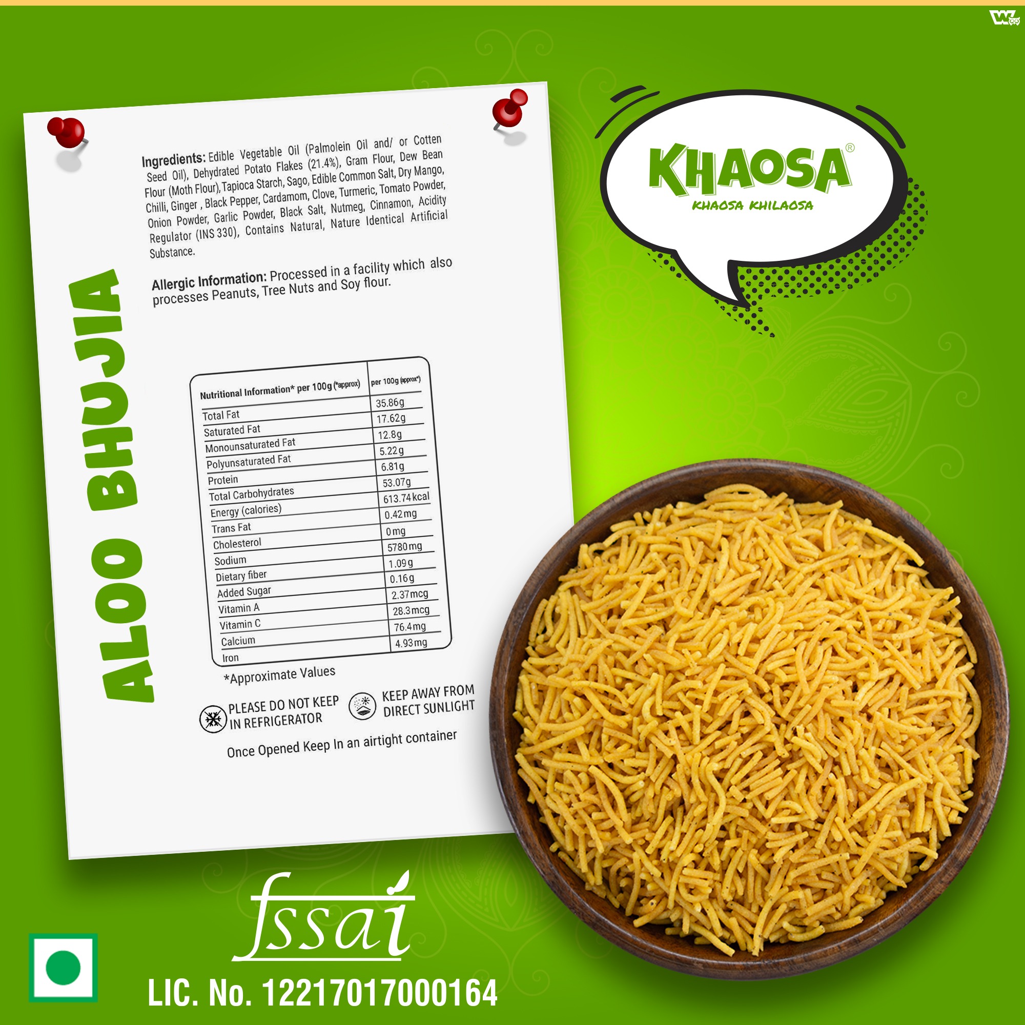 Khaosa’s Aloo Bhujia is a delicious snack made with dehydrated potato flakes, gram flour, and a blend of aromatic spices like chili, ginger, and cardamom. It also contains dried mango, tomato powder, and natural and artificial flavorings. Enjoy this savory treat with a unique taste experience!